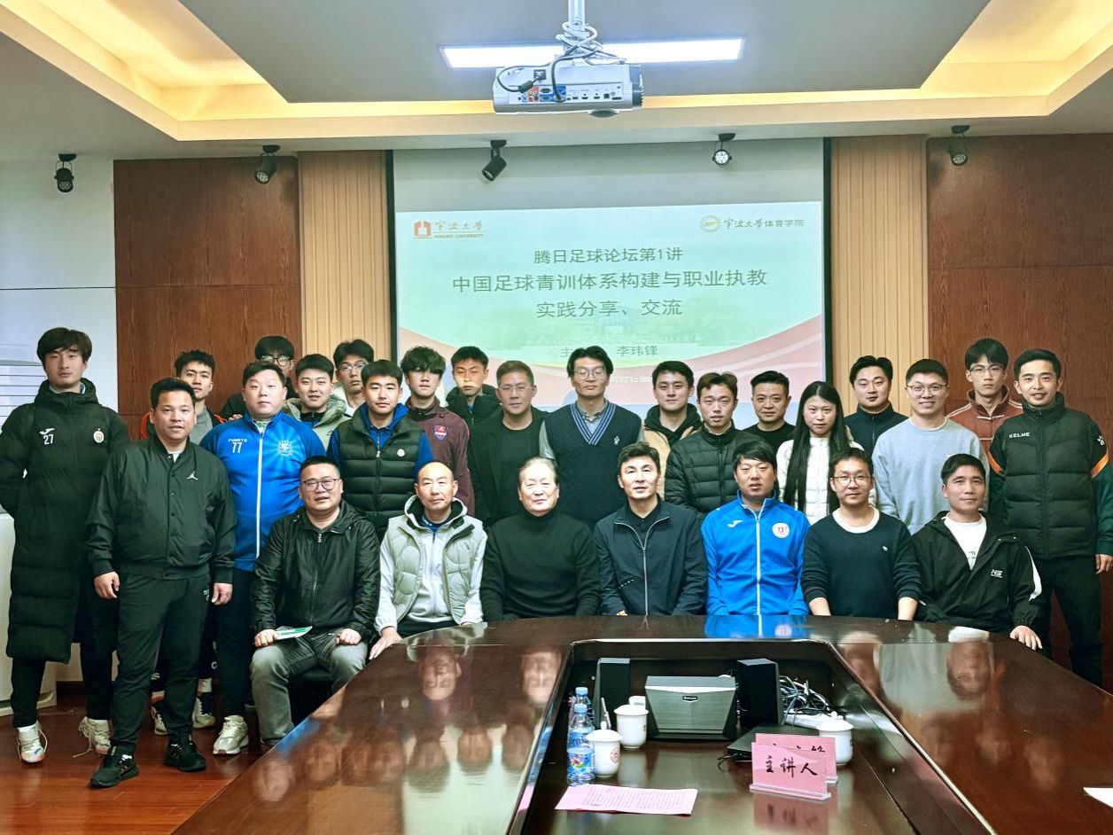 报告中,李玮锋结合其职业生涯——包括入选健力宝青年队赴巴西集训、代表国足冲击世界杯、效力于中超、英超及K联赛等多国顶级联赛的经历,以及转型后在青训建设、职业俱乐部管理与执教方面的实践,系统阐述了青训体系的构建逻辑、职业执教的方法路径以及青少年足球人才的选拔与培养机制。他通过实战案例与体系化分析,深入探讨当前国内青训发展中的关键问题与解决方向,强调“体教融合、专业体系、长期坚持”在足球人才培养中的重要作用。朱广沪在主持中对报告的专业性与实践价值给予充分肯定,并鼓励在场师生与从业者以此为契机,持续深耕足球教育与青训领域,共同推动宁波及全国足球后备人才的培养与储备。